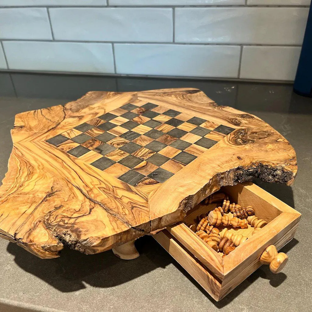 Schachbrett Olivenholz Naturkante 30cm – Rustikal | Handgefertigt Schweiz